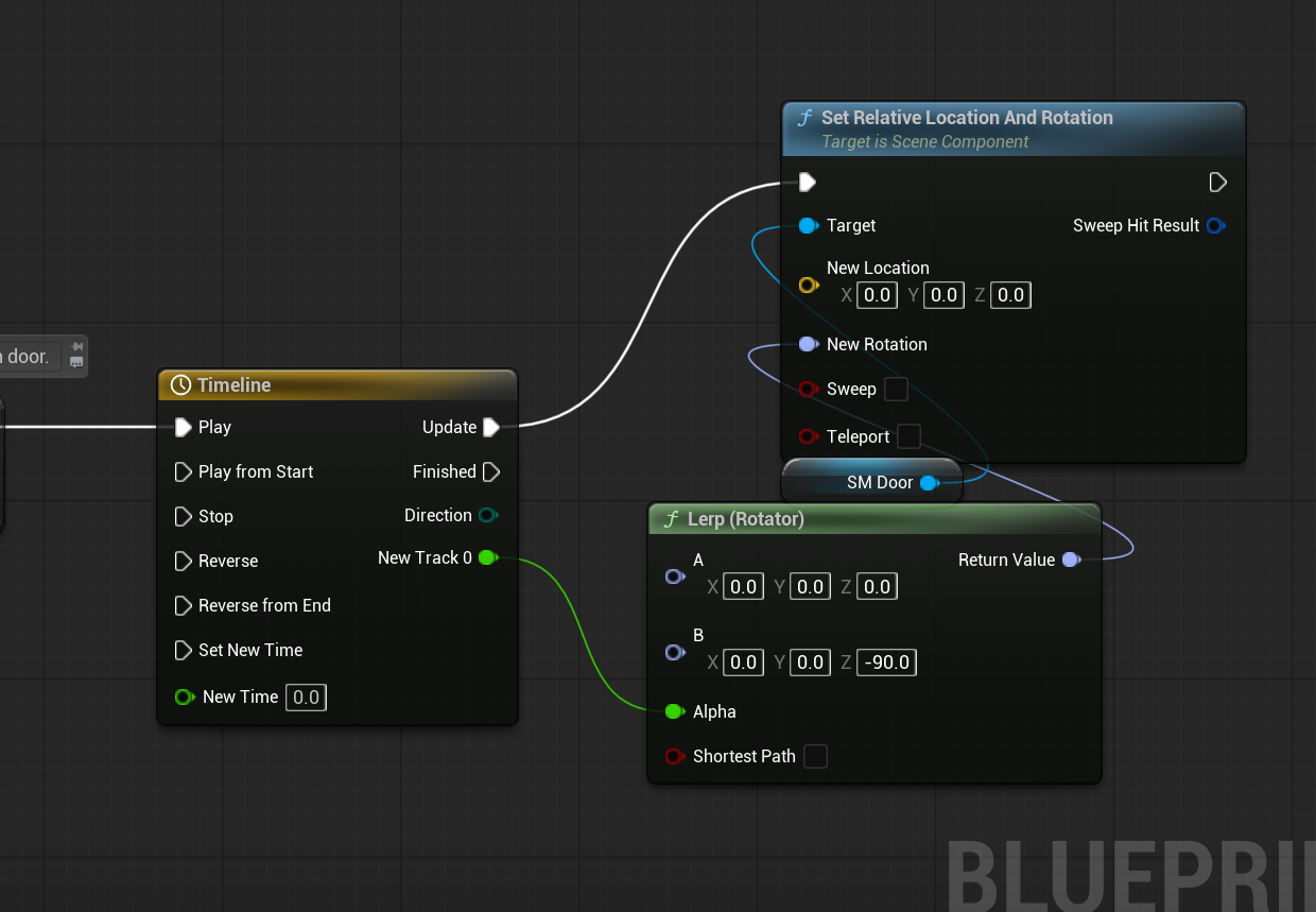 Using the level and blueprints already in this template, I found a couple of things to add a little bit of polish to. Firstly, I added an animation to the doors so they now swing open like a normal door instead of just disappearing.