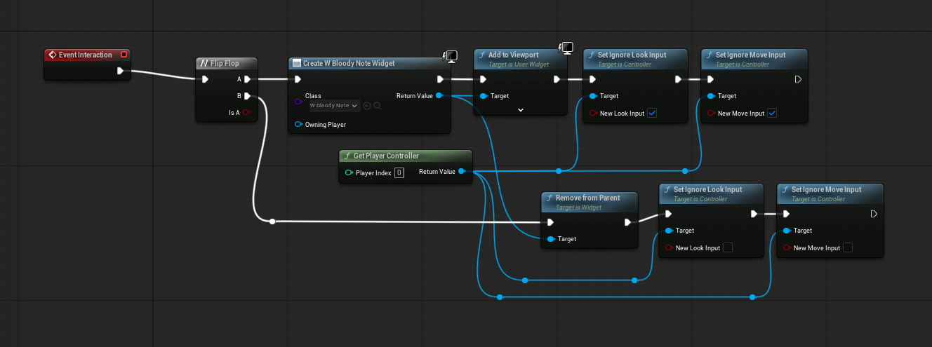 Using this interaction system, the first thing I added was a way to look at and read notes. This code essentially creates a widget of the note when interacted with, using the flip flop t put it away and restore movement. The physical note is just a thin rectangle with a material of the note image added to it.