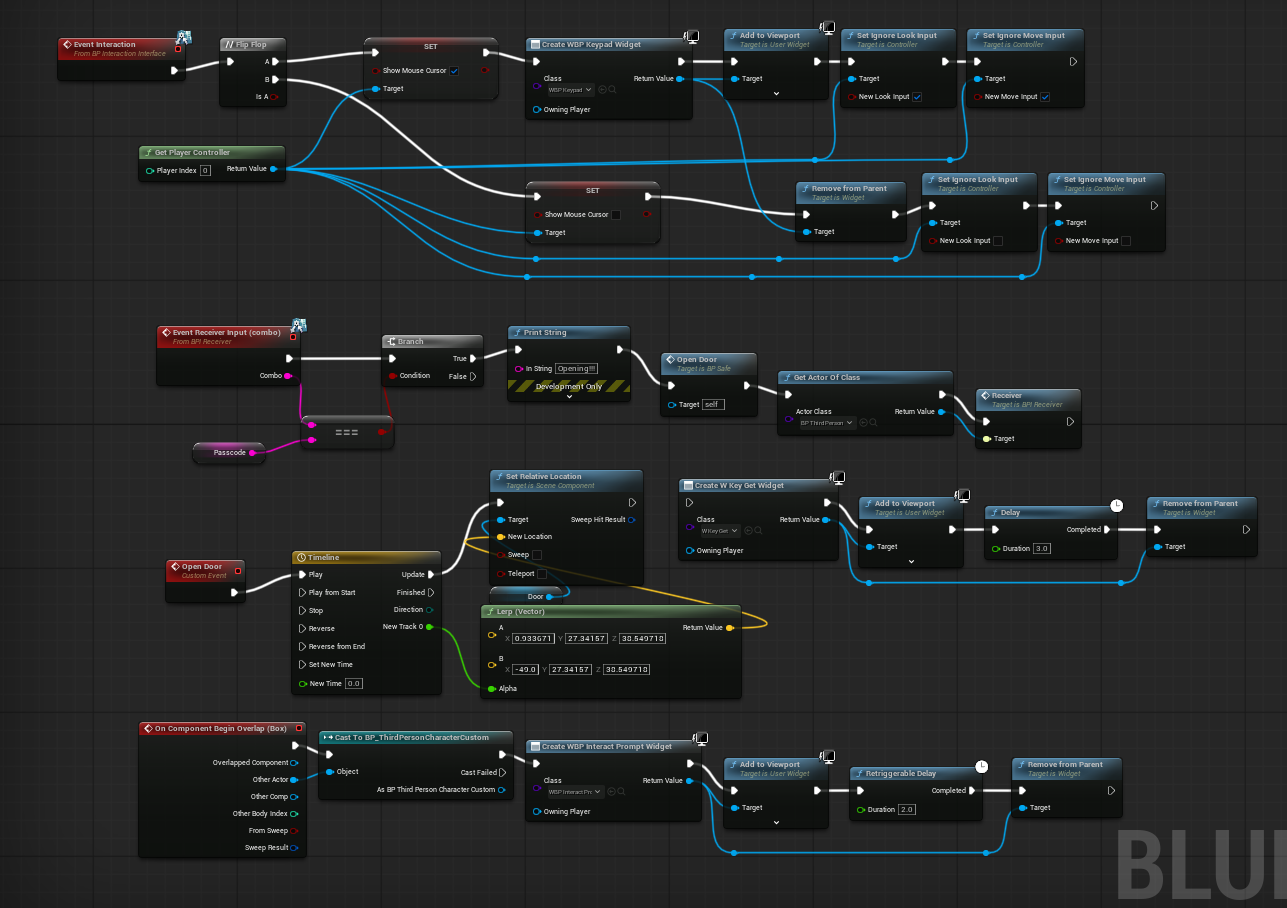 Finally, there's the actual safe. It starts off similarly to the note, but will instead bring up the keypad widget when interacted with, and also showing the mouse cursor. When you press the enter button on the keypad, I used a blueprint interface which allows the combo from the keypad to be passed to the safe, which it then checks. If the combo and passcode are the same, it triggers the safe door to open with a little sliding door animation.