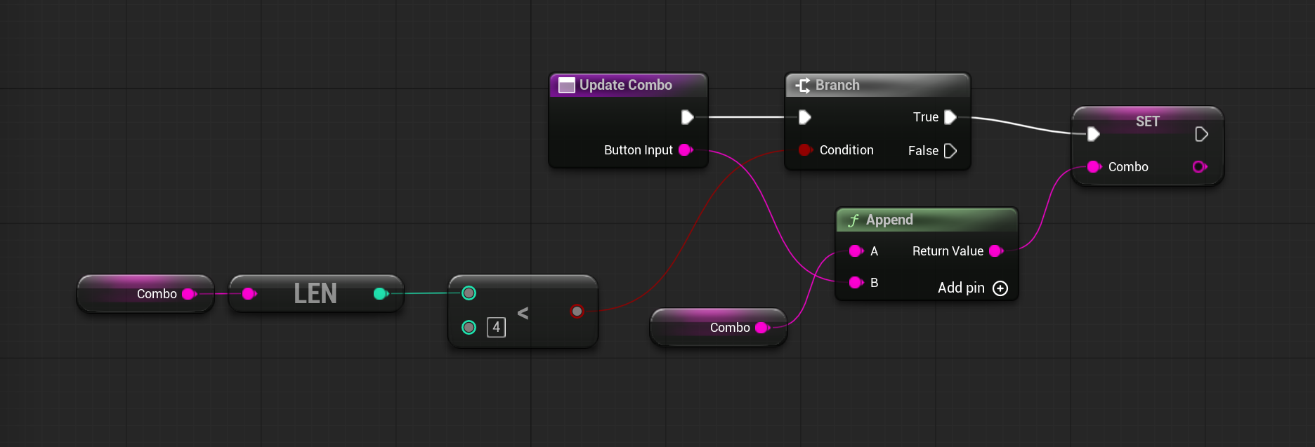 The function code (Update Combo) will actually write the inputted numbers to the text box in the widget, and also checks the length of the code to make sure the player can't type in numbers infinitely.